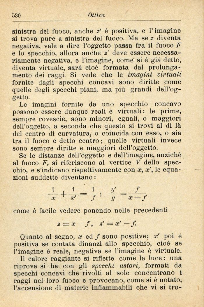 sinistra del fuoco, anche z' è positiva, e l'imagine si trova pure a sinistra del'fuoco. Ma se z diventa negativa, vale a dire l'oggetto passa fra il fuoco F e lo specchio, allora anche z' deve essere necessariamente negativa, e l'imagine, come si è già detto, diventa virtuale, sarà cioè formata dal prolungamento dei raggi. Si vede che le imagini virtuali fornite dagli specchi concavi sono diritte come quelle degli specchi piani, ma più grandi dell'oggetto.
