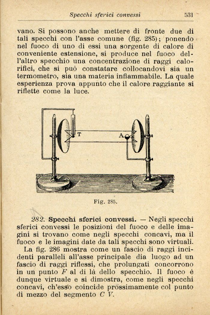 vano. Si possono anche mettere di fronte due di tali specchi con l'asse comune (fig. 285); ponendo nel fuoco di uno di essi una sorgente di calore di conveniente estensione, si produce nel fuoco dell'altro specchio una concentrazione di raggi calorifici, che si può constatare collocandovi sia un termometro, sia una materia infiammabile. La quale esperienza prova appunto che il calore raggiante si riflette come la luce.