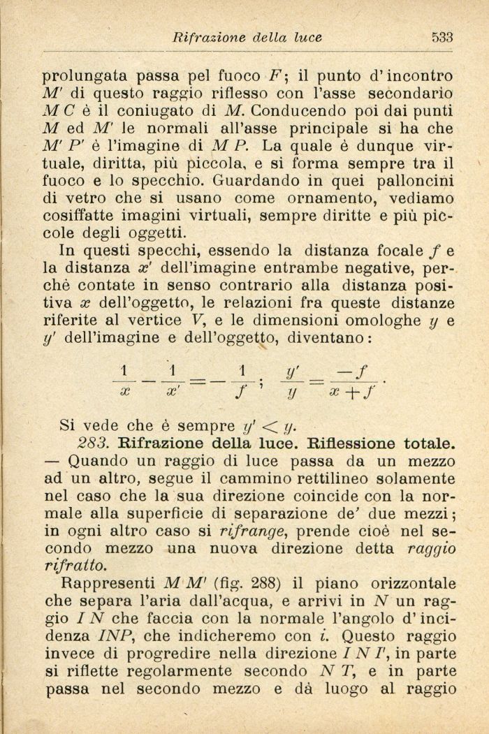 283. Rifrazione della luce. Riflessione totale. — Quando un raggio di luce passa da un mezzo ad un altro, segue il cammino rettilineo solamente nel caso che la sua direzione coincide con la normale alla superfìcie di separazione de' due mezzi ; in ogni altro caso si rifrange, prende cioè nel secondo mezzo una nuova direzione detta raggio rifratto.