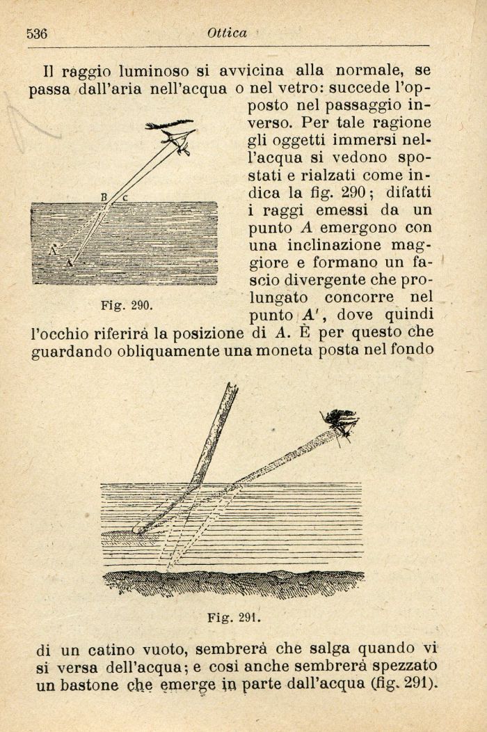 Il raggio luminoso si avvicina alla normale, se passa dall'aria nell'acqua o nel vetro: succede l'opposto nel passaggio inverso. Per tale ragione gli oggetti immersi nell'acqua si vedono spostati e rialzati come indica la fig. 290; difatti i raggi emessi da un punto A emergono con una inclinazione maggiore e formano un fascio divergente che prolungato concorre nel punto A', dove quindi l'occhio riferirā la posizione di A. Č per questo che guardando obliquamente una moneta posta nel fondo
