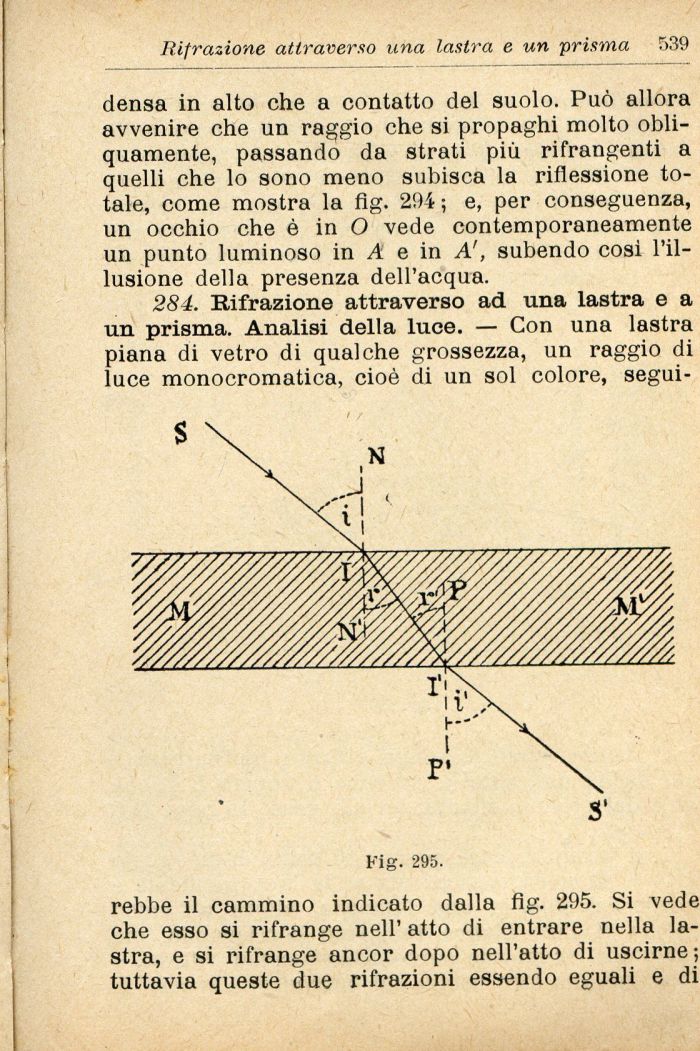 rebbe il cammino indicato dalla fig. 295. Si vede che esso si rifrange nell' atto di entrare nella lastra, e si rifrange ancor dopo nell'atto di uscirne; tuttavia queste due rifrazioni essendo eguali e di