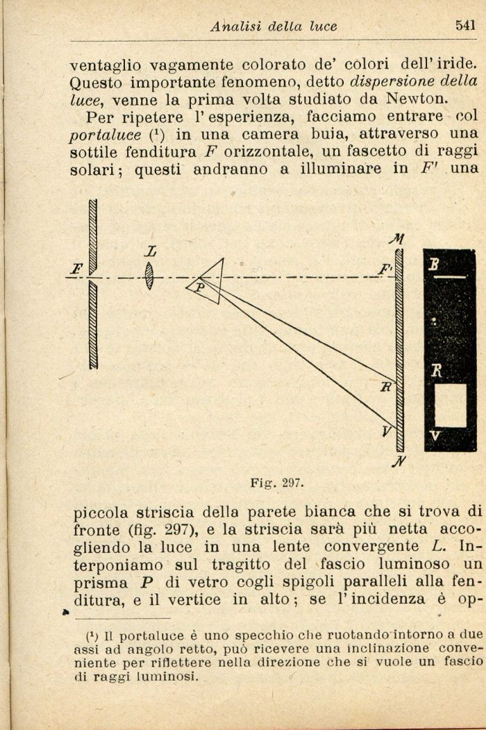 Per ripetere l'esperienza, facciamo entrare col portaluce (') in una camera buia, attraverso una sottile fenditura F orizzontale, un fascetto di raggi solari ; questi andranno a illuminare in F' una