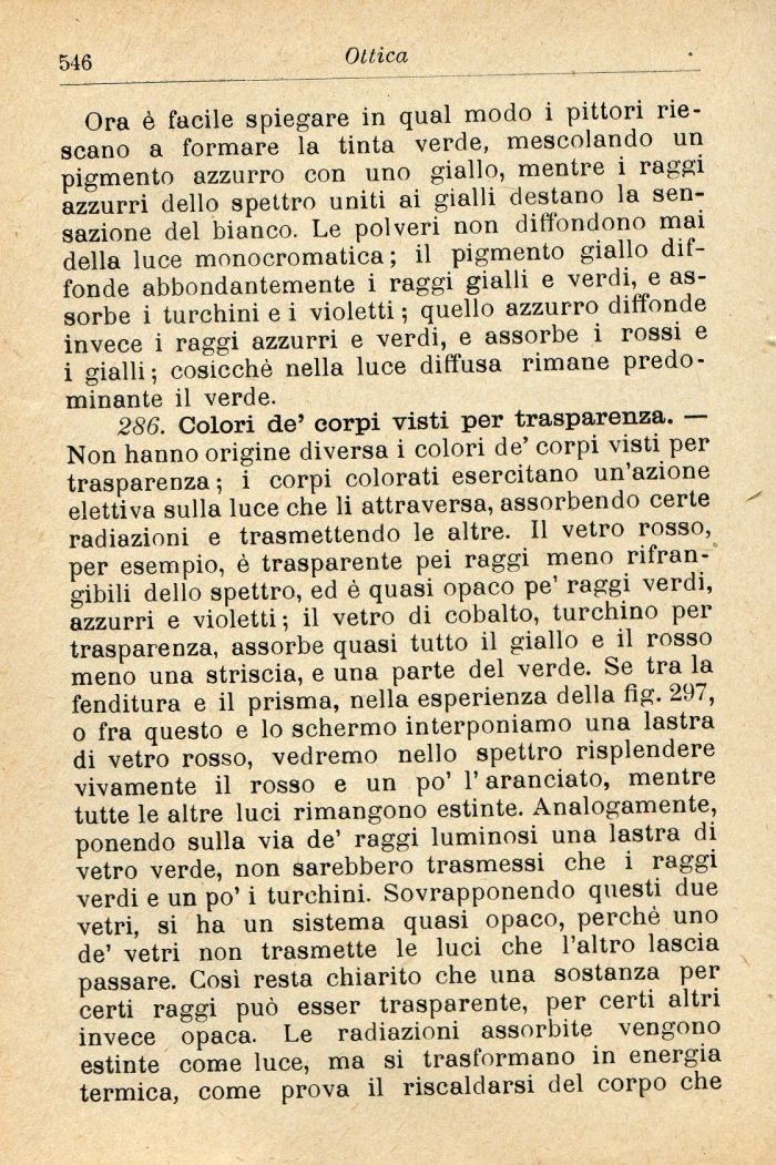 Ora è facile spiegare in qual modo i pittori riescano a formare la tinta verde, mescolando un pigmento azzurro con uno giallo, mentre i raggi azzurri dello spettro uniti ai gialli destano la sensazione del bianco. Le polveri non diffondono mai della luce monocromatica; il pigmento giallo diffonde abbondantemente i raggi gialli e verdi, e assorbe i turchini e i violetti ; quello azzurro diffonde invece i raggi azzurri e verdi, e assorbe i rossi e i gialli; cosicché nella luce diffusa rimane predominante il verde.