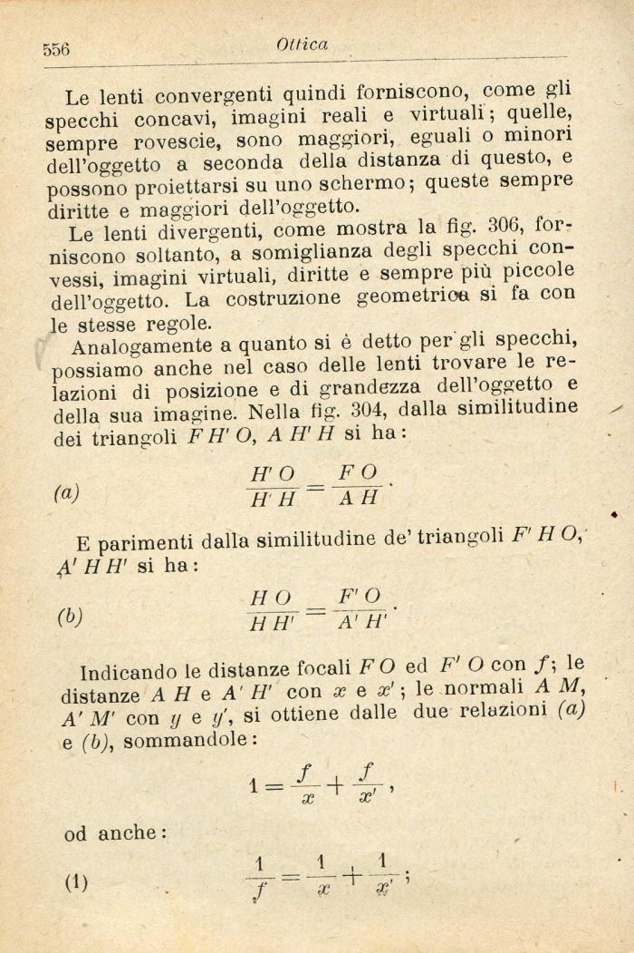 Analogamente a quanto si è detto per gli specchi, possiamo anche nel caso delle lenti trovare le relazioni di posizione e di grandezza dell'oggetto e della sua imagine. Nella fig. 304, dalla similitudine dei triangoli F H' O, A IT H si ha :