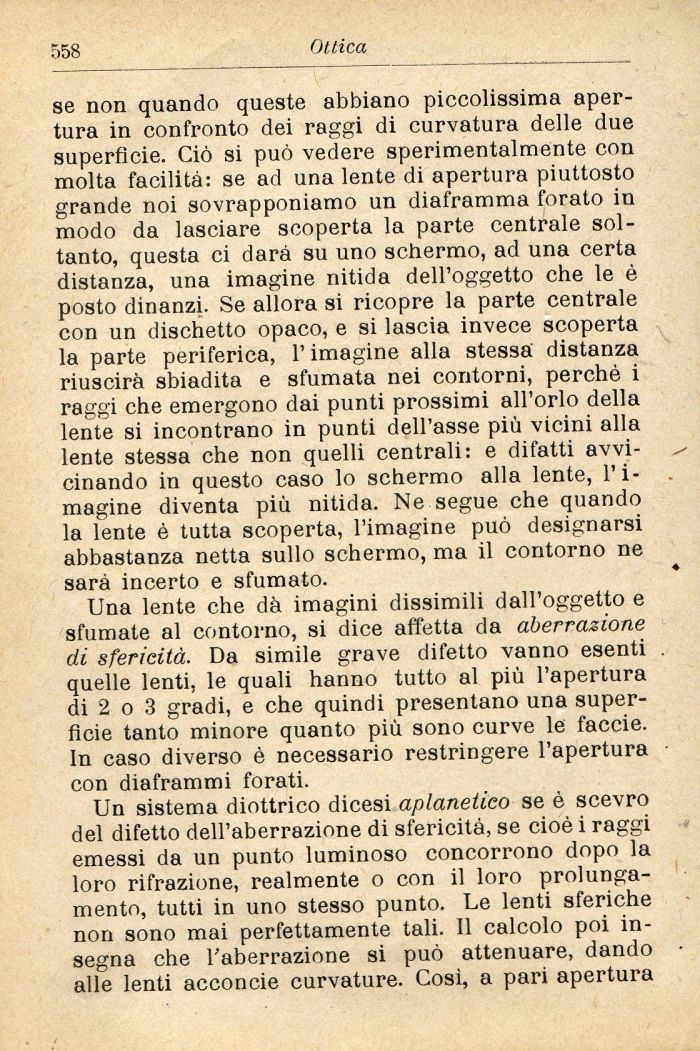 se non quando queste abbiano piccolissima apertura in confronto dei raggi di curvatura delle due superficie. Ciò si può vedere sperimentalmente con molta facilità: se ad una lente di apertura piuttosto grande noi sovrapponiamo un diaframma forato in modo da lasciare scoperta la parte centrale soltanto, questa ci darà su uno schermo, ad una certa distanza, una imagine nitida dell'oggetto che le è posto dinanzi. Se allora si ricopre la parte centrale con un dischetto opaco, e si lascia invece scoperta la parte periferica, l'imagine alla stessa distanza riuscirà sbiadita e sfumata nei contorni, perchè i raggi che emergono dai punti prossimi all'orlo della lente si incontrano in punti dell'asse più vicini alla lente stessa che non quelli centrali: e difatti avvicinando in questo caso lo schermo alla lente, l'i-magine diventa più nitida. Ne segue che quando la lente è tutta scoperta, l'imagine può designarsi abbastanza netta sullo schermo, ma il contorno ne sarà incerto e sfumato.
