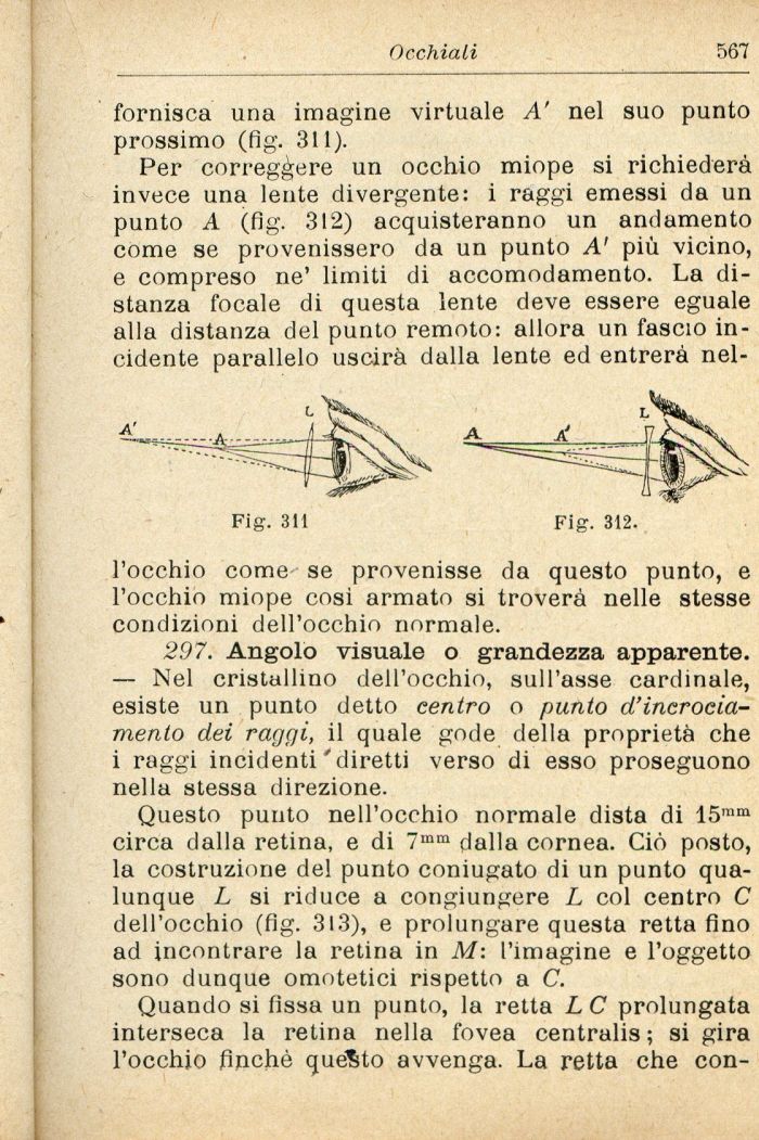 Per correggere un occhio miope si richiederà invece una lente divergente: i raggi emessi da un punto A (fig. 312) acquisteranno un andamento come se provenissero da un punto A' più vicino, e compreso ne' limiti di accomodamento. La distanza focale di questa lente deve essere eguale alla distanza del punto remoto: allora un fascio incidente parallelo uscirà dalla lente ed entrerà nel-