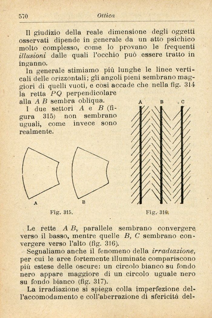 In generale stimiamo più lunghe le linee verticali delle orizzontali; gli angoli pieni sembrano maggiori di quelli vuoti, e così accade che nella fig. 314 la retta PQ perpendicolare alla A B sembra obliqua.