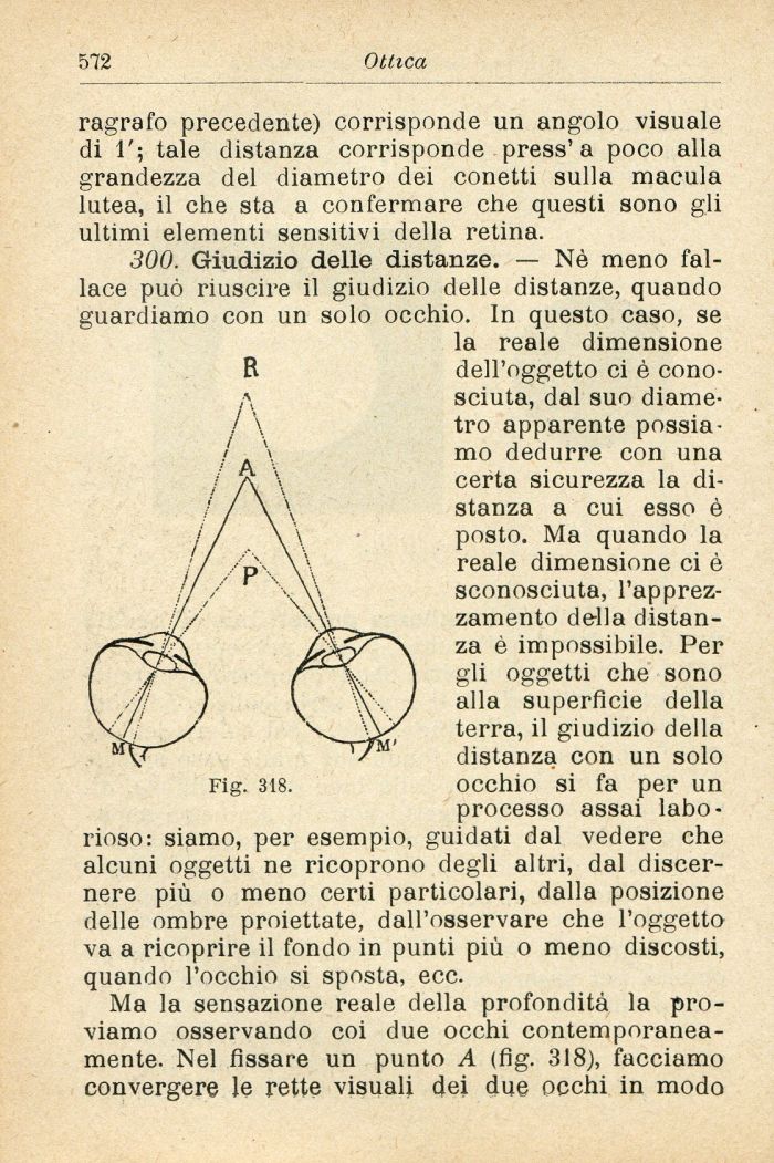 300. Giudizio delle distanze. — Nè meno fallace può riuscire il giudizio delle distanze, quando guardiamo con un solo occhio. In questo caso, se