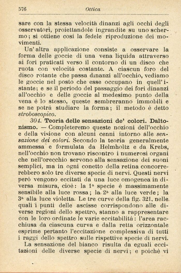 304. Teoria delle sensazioni de' colori. Daltonismo. — Completeremo queste nozioni dell'occhio e della visione con alcuni cenni intorno alle sensazione dei colori. Secondo la teoria generalmente ammessa e formulata da Helmholtz e da Krebs, nell'occhio non trovano riscontro i numerosi organi che nell'orecchio servono alla sensazione dei suoni semplici, ma in ogni conetto della retina concorrerebbero solo tre diverse specie di nervi. Questi nervi però vengono eccitati da una luce omogenea in diversa misura, cioè: la la specie è massimamente sensibile alla luce rossa; la 2a alla luce verde; la 3a alla luce violetta. Le tre curve della fig. 321. nelle quali i punti delle ascisse corrispondono alle diverse regioni dello spettro, stanno a rappresentare con le loro ordinate le varie eccitabilità : l'area racchiusa da ciascuna curva e dalla retta orizzontale esprime pertanto l'eccitazione complessiva di tutti i raggi dello spettro sulle rispettive specie di nervi.