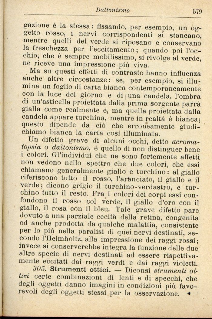 Un difetto grave di alcuni occhi, detto acromatopsia o daltonismo, è quello di non distinguer bene i colori. Gl'individui che ne sono fortemente affetti non vedono nello spettro che due colori, che essi chiamano generalmente giallo e turchino : al giallo riferiscono tutto il rosso, l'aranciato, il giallo e il verde; dicono grigio il turchino-verdastro, e turchino tutto il resto. Fra i colori dei corpi essi confondono il rosso col verde, il giallo d'oro con il giallo, il rosa con il bleu. Tale grave difetto pare dovuto a una parziale cecità della retina, congenita od anche prodotta da qualche malattia, consistente per lo più nella paralisi di quei nervi destinati, secondo l'Helmholtz, alla impressione dei raggi rossi; invece si conserverebbe integra la funzione delle due altre specie di nervi destinati ad essere rispettivamente eccitati dai raggi verdi e dai raggi violetti.