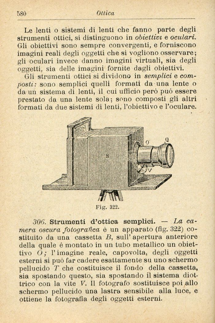 306. Strumenti d'ottica semplici. — La camera oscura fotografica è un apparato (fìg. 322) costituito da una cassetta B, sull' apertura anteriore della quale è montato in un tubo metallico un obiettivo O; l'imagine reale, capovolta, degli oggetti esterni si può far cadere esattamente su uno schermo pellucido T che costituisce il fondo della cassetta, sia spostando questo, sia spostando il sistema diottrico con la vite V. Il fotografo sostituisce poi allo schermo pellucido lina lastra sensibile alla luce, e ottiene la fotografia degli oggetti esterni.