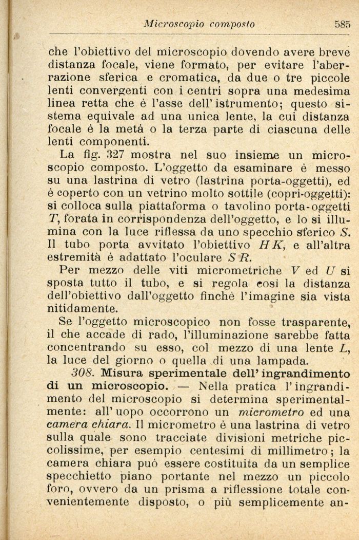 La flg. 327 mostra nel suo insieme un microscopio composto. L'oggetto da esaminare è messo su una lastrina di vetro (lastrina porta-oggetti), ed è coperto con un vetrino molto sottile (copri-oggetti): si colloca sulla piattaforma o tavolino porta-oggetti T, forata in corrispondenza dell'oggetto, e lo si illumina con la luce riflessa da uno specchio sferico S. Il tubo porta avvitato l'obiettivo HK, e all'altra estremità è adattato l'oculare S R.