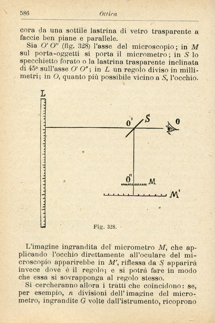 Sia O' O (fig. 328) l'asse del microscopio ; in M sul porta-oggetti si porta il micrometro ; in S lo specchietto forato o la lastrina trasparente inclinata di 45° sull'asse O' O; in L un regolo diviso in millimetri; in O, quanto più possibile vicino a S, l'occhio.