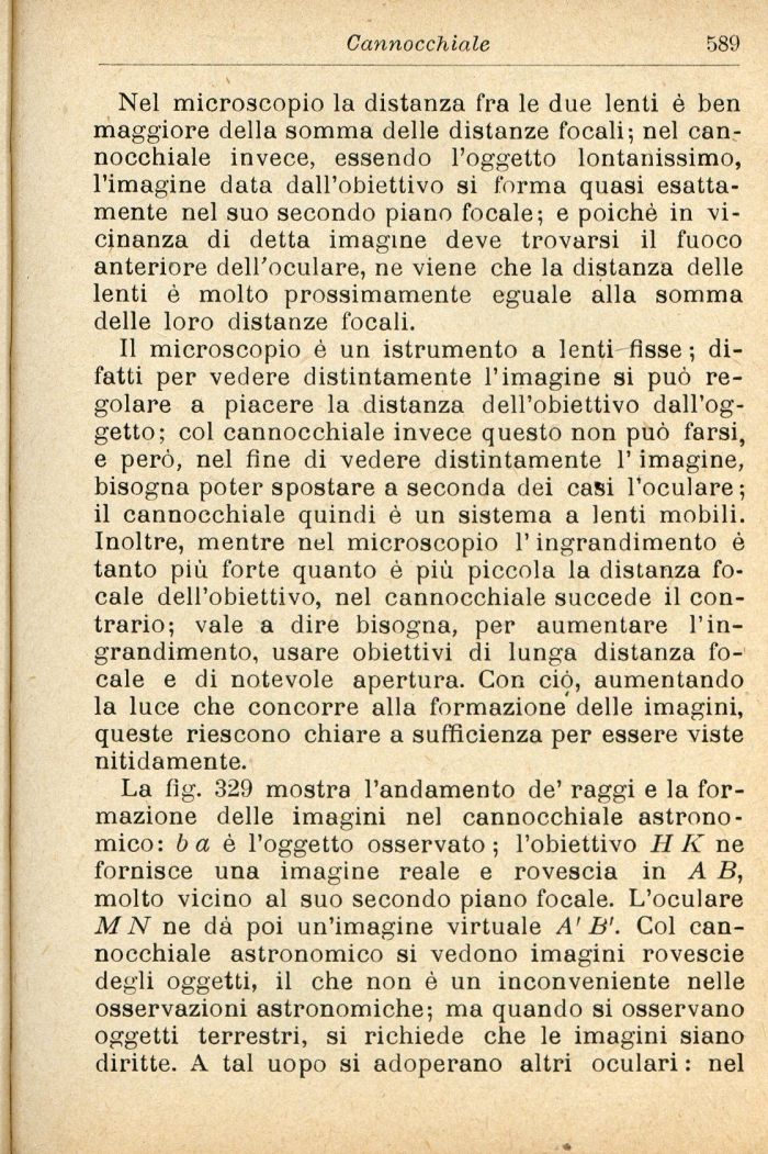 La fig. 329 mostra l'andamento de' raggi e la formazione delle imagini nel cannocchiale astronomico: ba è l'oggetto osservato; l'obiettivo HK ne fornisce una imagine reale e rovescia in A B, molto vicino al suo secondo piano focale. L'oculare MN ne dà poi un'imagine virtuale A' B'. Col cannocchiale astronomico si vedono imagini rovescie degli oggetti, il che non è un inconveniente nelle osservazioni astronomiche; ma quando si osservano oggetti terrestri, si richiede che le imagini siano diritte. A tal uopo si adoperano altri oculari : nel