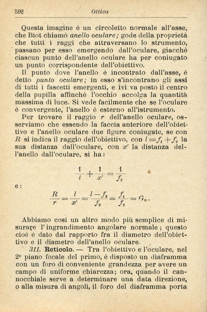 Il punto dove l'anello è incontrato dall'asse, è detto punto oculare ; in esso s'incontrano gli assi di tutti i fascetti emergenti, e ivi va posto il centro della pupilla affinchè l'occhio accolga la quantità massima di luce. Si vede facilmente che se l'oculare è convergente, l'anello è esterno all'istrumento.