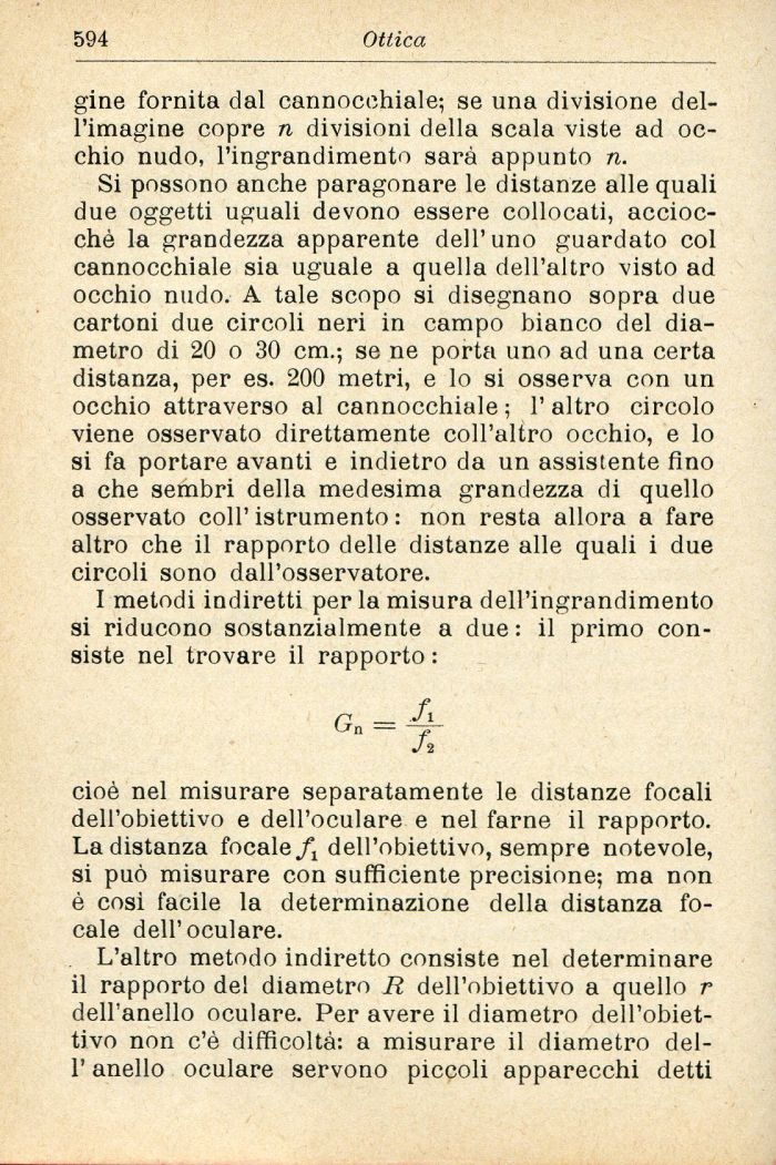 cioè nel misurare separatamente le distanze focali dell'obiettivo e dell'oculare e nel farne il rapporto. La distanza focale dell'obiettivo, sempre notevole, si può misurare con sufficiente precisione; ma non è così facile la determinazione della distanza focale dell'oculare.