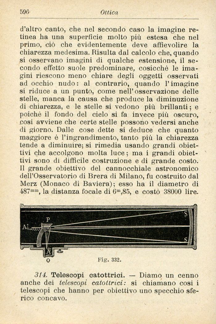314. Telescopi catottrici. — Diamo un cenno anche dei telescopi catottrici: si chiamano cosi i telescopi che hanno per obiettivo uno specchio sferico concavo.