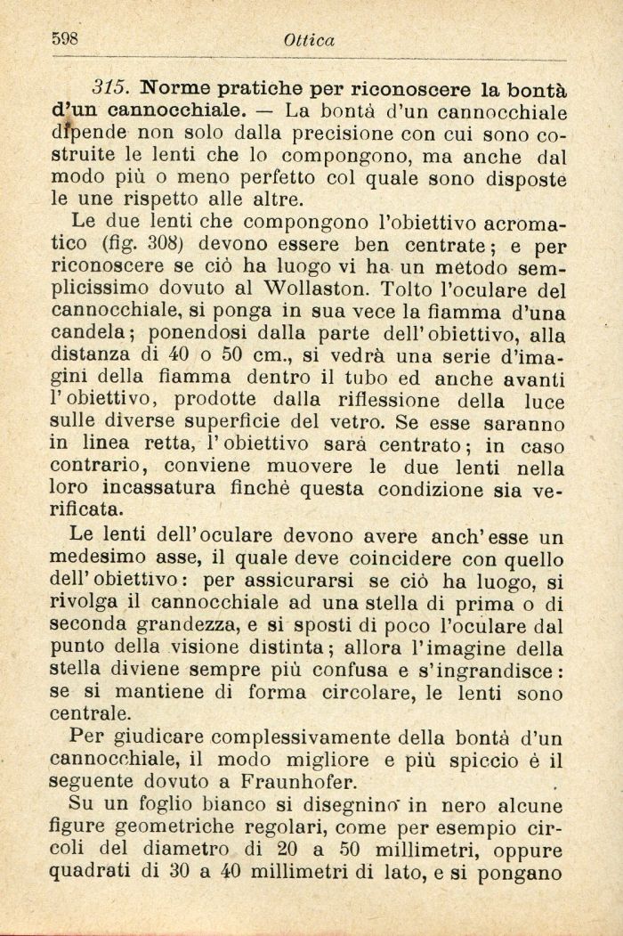 315. Norme pratiche per riconoscere la bontà d'un cannocchiale. — La bontà d'un cannocchiale dfpende non solo dalla precisione con cui sono costruite le lenti che lo compongono, ma anche dal modo più o meno perfetto col quale sono disposte le une rispetto alle altre.