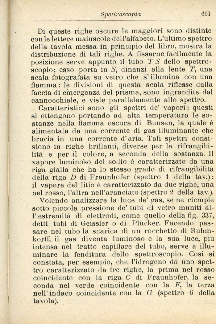 Volendo analizzare la luce de' gas, se ne riempie sotto piccola pressione de' tubi di vetro muniti all' estremità di elettrodi, come quello della fig. 337, detti tubi di Geissler o di Plucker. Facendo passare nel tubo la scarica di un rocchetto di Ruhm-korff, il gas diventa luminoso e la sua luce, più intensa nel tratto capillare del tubo, serve a illuminare la fenditura dello spettroscopio. Cosi si constata, per esempio, che l'idrogeno dà uno spettro caratterizzato da tre righe, la prima nel rosso coincidente con la riga C di Fraunhofer, la seconda nel verde coincidente con la F, la terza nell' indaco coincidente con la G (spettro 6 della tavola).