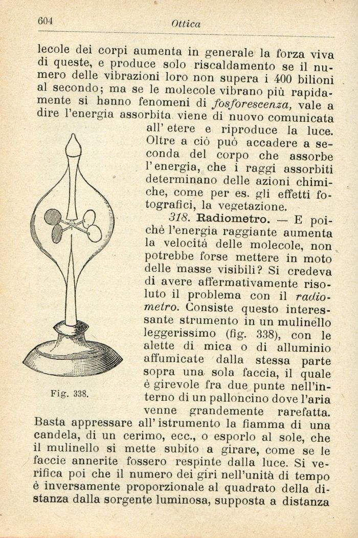 318. Radiometro. — E poiché l'energia raggiante aumenta la velocità delle molecole, non potrebbe forse mettere in moto delle masse visibili? Si credeva di avere affermativamente risoluto il problema con il radiometro. Consiste questo interessante strumento in un mulinello leggerissimo (fig. 338), con le alette di mica o di alluminio affumicate dalla stessa parte sopra una sola faccia, il quale è girevole fra due punte nell'interno di un palloncino dove l'aria venne grandemente rarefatta. Basta appressare all' istrumento la fiamma di una candela, di un cerimo, ecc., o esporlo al sole, che il mulinello si mette subito a girare, come se le faccie annerite fossero respinte dalla luce. Si verifica poi che il numero dei giri nell'unità di tempo è inversamente proporzionale al quadrato della distanza dalla sorgente luminosa, supposta a distanza