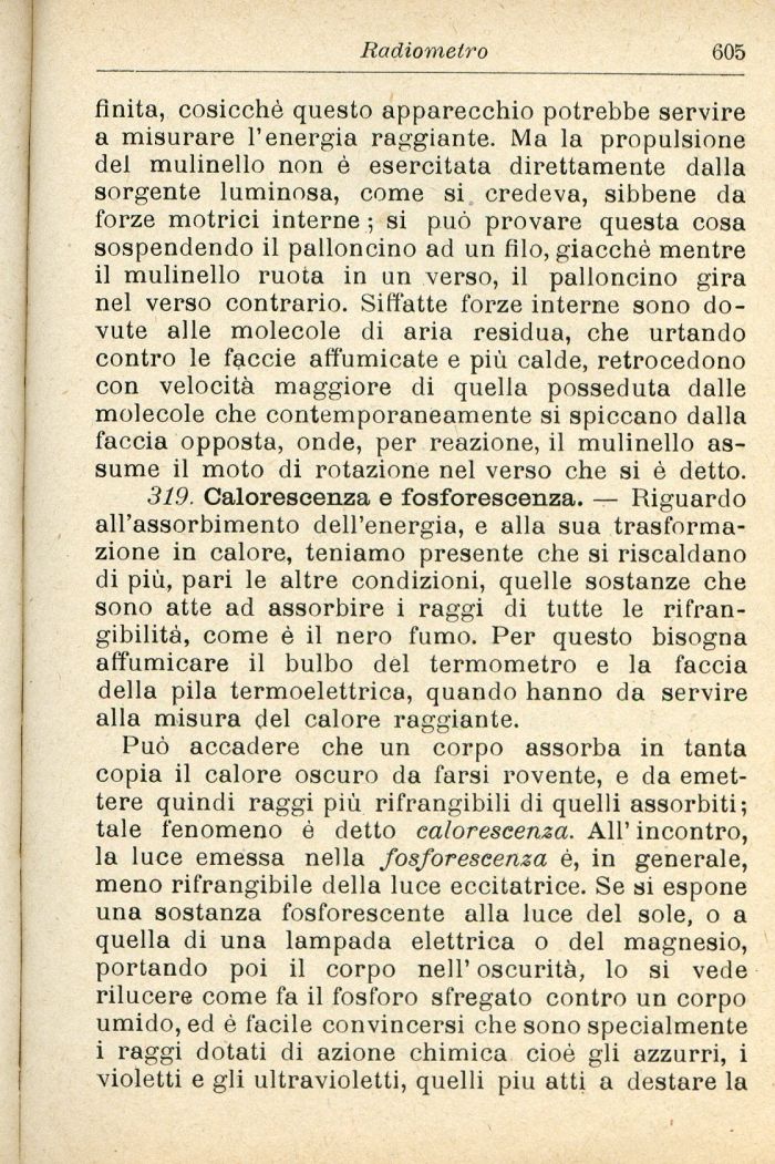 319. Calorescenza e fosforescenza. — Riguardo all'assorbimento dell'energia, e alla sua trasformazione in calore, teniamo presente che si riscaldano di più, pari le altre condizioni, quelle sostanze che sono atte ad assorbire i raggi di tutte le rifrangibilità, come è il nero fumo. Per questo bisogna affumicare il bulbo del termometro e la faccia della pila termoelettrica, quando hanno da servire alla misura del calore raggiante.