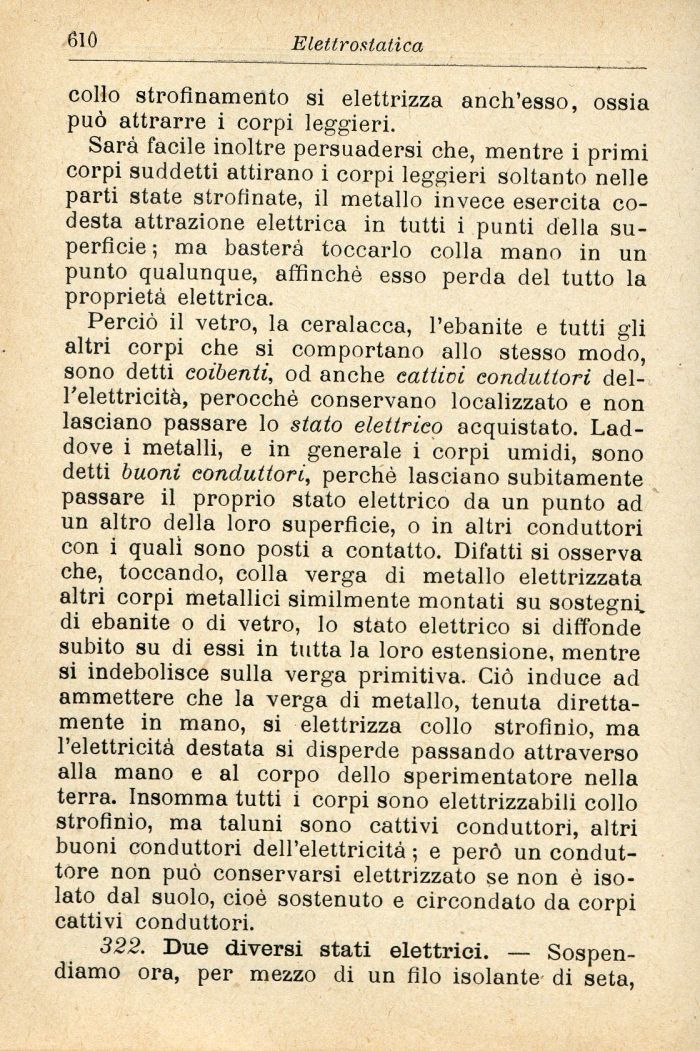 Perciò il vetro, la ceralacca, l'ebanite e tutti gli altri corpi che si comportano allo stesso modo, sono detti coibenti, od anche cattici conduttori dell'elettricità, perocché conservano localizzato e non lasciano passare lo stato elettrico acquistato. Laddove i metalli, e in generale i corpi umidi, sono detti buoni conduttori, perchè lasciano subitamente passare il proprio stato elettrico da un punto ad un altro della loro superficie, o in altri conduttori con i quali sono posti a contatto. Difatti si osserva che, toccando, colla verga di metallo elettrizzata altri corpi metallici similmente montati su sostegni, di ebanite o di vetro, lo stato elettrico si diffonde subito su di essi in tutta la loro estensione, mentre si indebolisce sulla verga primitiva. Ciò induce ad ammettere che la verga di metallo, tenuta direttamente in mano, si elettrizza collo strofinio, ma l'elettricità destata si disperde passando attraverso alla mano e al corpo dello sperimentatore nella terra. Insomma tutti i corpi sono elettrizzabili collo strofinio, ma taluni sono cattivi conduttori, altri buoni conduttori dell'elettricità ; e però un conduttore non può conservarsi elettrizzato se non è isolato dal suolo, cioè sostenuto e circondato da corpi cattivi conduttori.