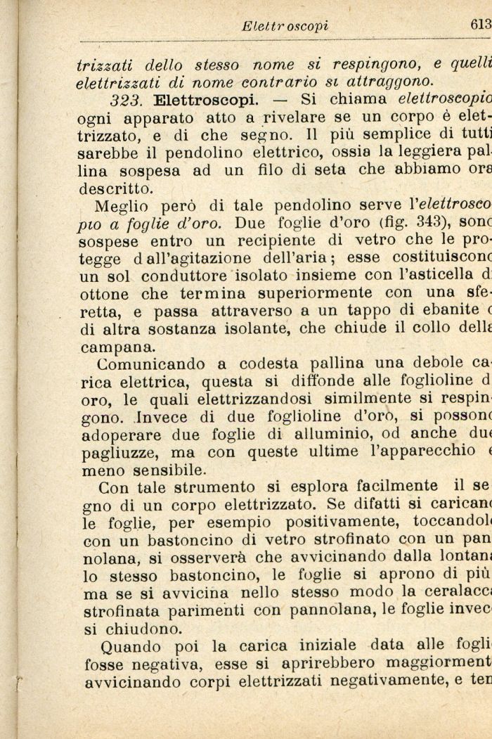 323. Elettroscopi. — Si chiama elettroscopic ogni apparato atto a rivelare se un corpo è elettrizzato, e di che segno. Il più semplice di tutti sarebbe il pendolino elettrico, ossia la leggiera pai lina sospesa ad un filo di seta che abbiamo ore descritto.