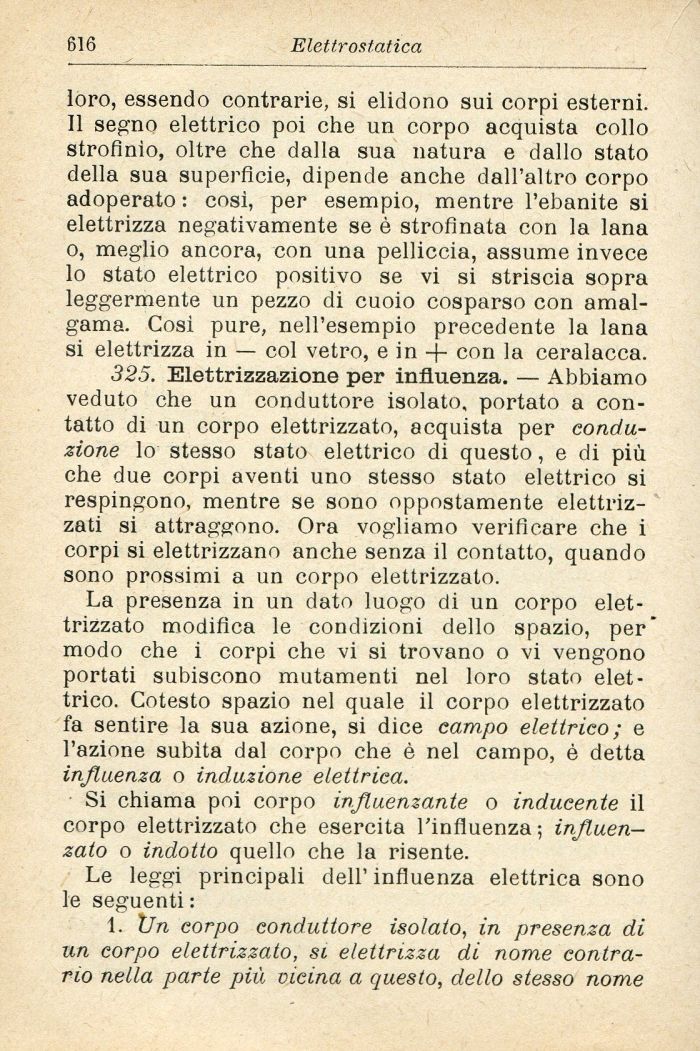 La presenza in un dato luogo di un corpo elettrizzato modifica le condizioni dello spazio, per modo che i corpi che vi si trovano o vi vengono portati subiscono mutamenti nel loro stato elettrico. Cotesto spazio nel quale il corpo elettrizzato fa sentire la sua azione, si dice campo elettrico; e l'azione subita dal corpo che è nel campo, è detta influenza o induzione elettrica.