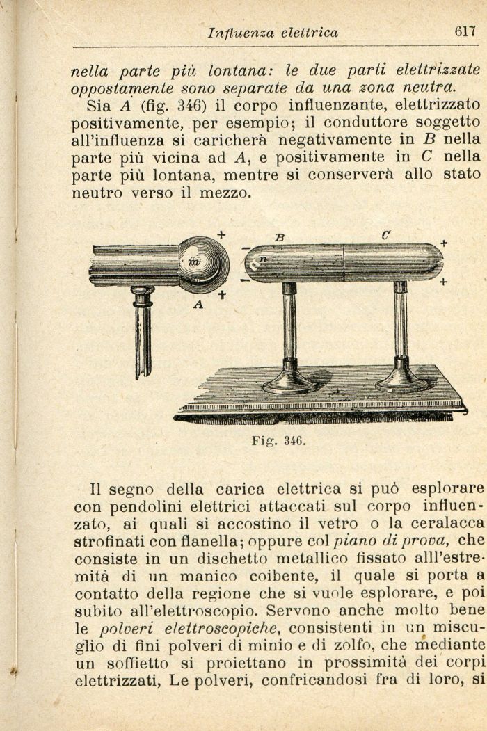 Sia A (fig. 346) il corpo influenzante, elettrizzato positivamente, per esempio; il conduttore soggetto all'influenza si caricherà negativamente in B nella parte più vicina ad A, e positivamente in C nella parte più lontana, mentre si conserverà allo stato neutro verso il mezzo.