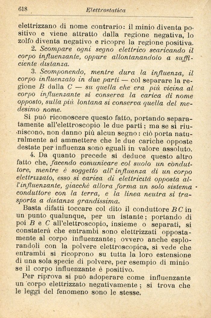 Basta difatti toccare col dito il conduttore BC in un punto qualunque, per un istante ; portando di poi B e C all'elettroscopio, insieme o separati, si constaterà che entrambi sono elettrizzati oppostamente al corpo influenzante; ovvero anche esplorandoli con la polvere elettroscopica, si vede che entrambi si ricoprono su tutta la loro estensione di una sola specie di polvere, per esempio di minio se il corpo influenzante è positivo.