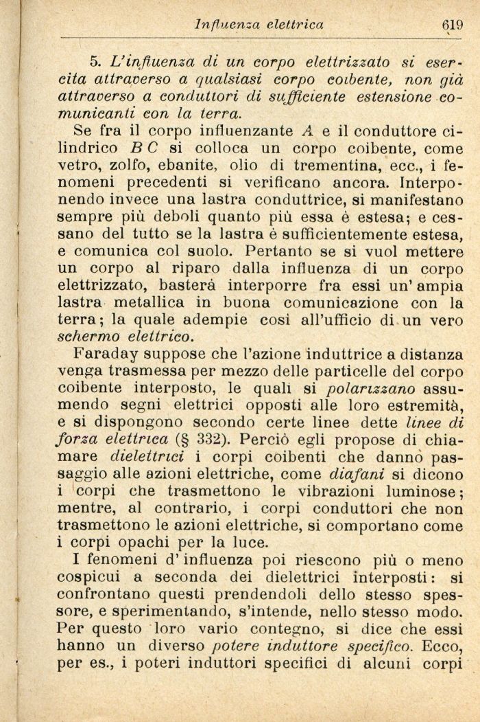 Faraday suppose che l'azione induttrice a distanza venga trasmessa per mezzo delle particelle del corpo coibente interposto, le quali si polarizzano assumendo segni elettrici opposti alle loro estremità, e si dispongono secondo certe linee dette linee di forza elettrica (§ 332). Perciò egli propose di chiamare dielettrici i corpi coibenti che dannò passaggio alle azioni elettriche, come diafani si dicono i corpi che trasmettono le vibrazioni luminose; mentre, al contrario, i corpi conduttori che non trasmettono le azioni elettriche, si comportano come i corpi opachi per la luce.