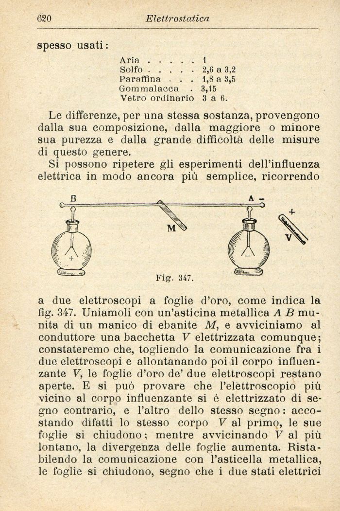 a due elettroscopi a foglie d'oro, come indica la fig. 347. Uniamoli con un'asticina metallica A B munita di un manico di ebanite M, e avviciniamo al conduttore una bacchetta V elettrizzata comunque; constateremo che, togliendo la comunicazione fra i due elettroscopi e allontanando poi il corpo influenzante V, le foglie d'oro de' due elettroscopi restano aperte. E si può provare che l'elettroscopio più vicino al corpo influenzante si è elettrizzato di segno contrario, e l'altro dello stesso segno : accostando difatti lo stesso corpo V al primo, le sue foglie si chiudono ; mentre avvicinando V al più lontano, la divergenza delle foglie aumenta. Ristabilendo la comunicazione con l'asticella metallica, le foglie si chiudono, segno che i due stati elettrici