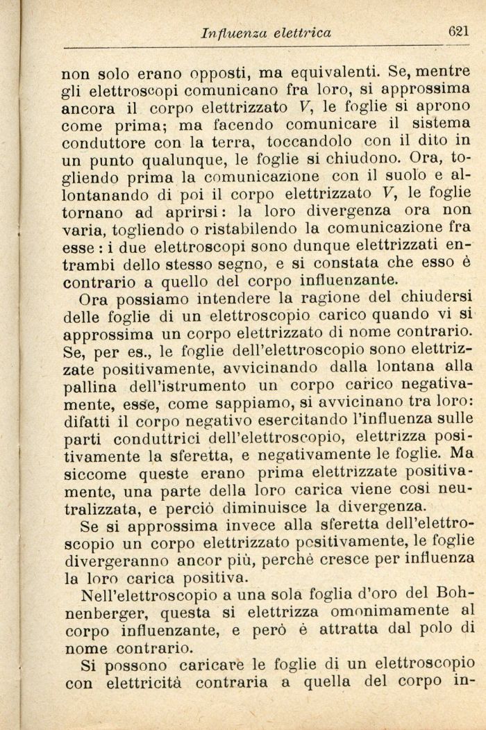 Ora possiamo intendere la ragione del chiudersi delle foglie di un elettroscopio carico quando vi si approssima un corpo elettrizzato di nome contrario. Se, per es., le foglie dell'elettroscopio sono elettrizzate positivamente, avvicinando dalla lontana alla pallina dell'istrumento un corpo carico negativamente, esse, come sappiamo, si avvicinano tra loro: difatti il corpo negativo esercitando l'influenza sulle parti conduttrici dell'elettroscopio, elettrizza positivamente la sferetta, e negativamente le foglie. Ma siccome queste erano prima elettrizzate positivamente, una parte della loro carica viene cosi neutralizzata, e perciò diminuisce la divergenza.