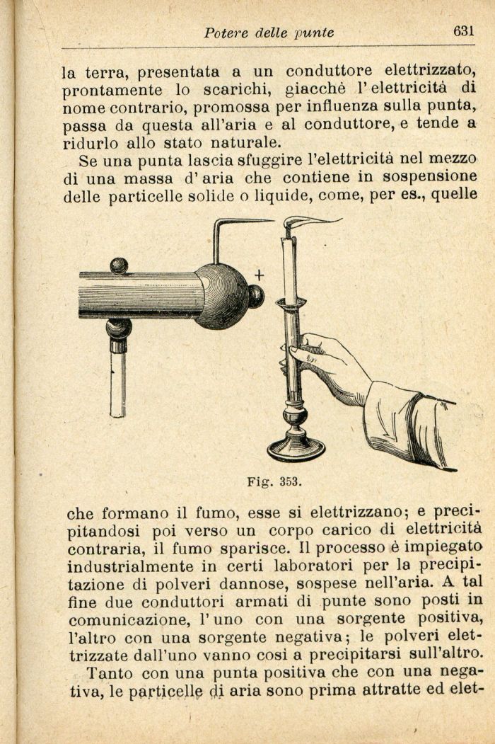 che formano il fumo, esse si elettrizzano; e precipitandosi poi verso un corpo carico di elettricità contraria, il fumo sparisce. Il processo è impiegato industrialmente in certi laboratori per la precipitazione di polveri dannose, sospese nell'aria. A tal fine due conduttori armati di punte sono posti in comunicazione, l'uno con una sorgente positiva, l'altro con una sorgente negativa; le polveri elettrizzate dall'uno vanno così a precipitarsi sull'altro.
