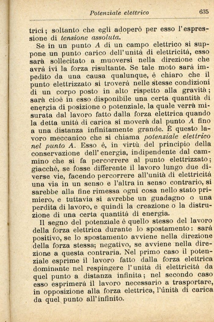 Se in un punto A di un campo elettrico si suppone un punto carico dell'unità di elettricità, esso sarà sollecitato a muoversi nella direzione che avrà ivi la forza risultante. Se tale moto sarà impedito da una causa qualunque, è chiaro che il punto elettrizzato si troverà nelle stesse condizioni di un corpo posto in alto rispetto alla gravità ; sarà cioè in esso disponibile una certa quantità di energia di posizione o potenziale, la quale verrà misurata dal lavoro fatto dalla forza elettrica quando la detta unità di carica si moverà dal punto A fino a una distanza infinitamente grande. È questo lavoro meccanico che si chiama potenziale elettrico nel punto A. Esso è, in virtù del principio della conservazione dell'energia, indipendente dal cammino che si fa percorrere al punto elettrizzato ; giacché, se fosse differente il lavoro lungo due diverse vie, facendo percorrere all'unità di elettricità una via in un senso e l'altra in senso contrario, si sarebbe alla fine rimessa ogni cosa nello stato primiero, e tuttavia si avrebbe un guadagno o una perdita di lavoro, e quindi la creazione o la distruzione di una certa quantità di energia.