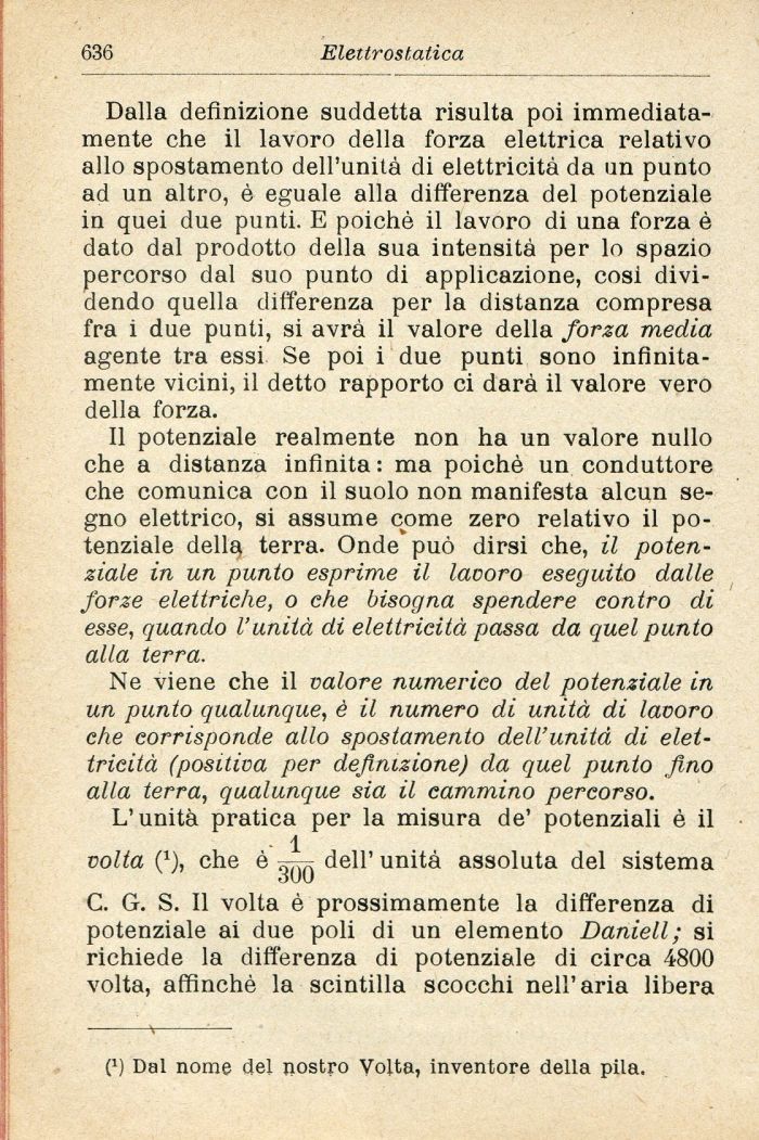 C. G. S. Il volta è prossimamente la differenza di potenziale ai due poli di un elemento Danieli; si richiede la differenza di potenziale di circa 4800 volta, affinchè la scintilla scocchi nell'aria libera