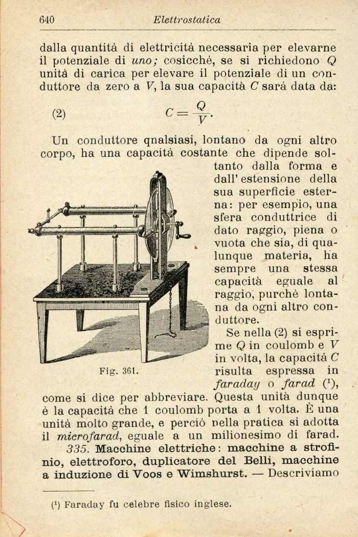 Se nella (2) si esprime Q in coulomb e V in volta, la capacità C Fig. 361. risulta espressa in