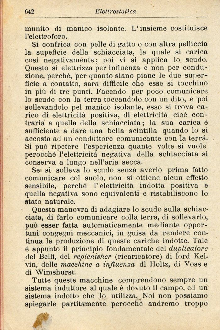 Si confrica con pelle di gatto o con altra pelliccia la supefìcie della schiacciata, la quale si carica cosi negativamente ; poi vi si applica lo scudo. Questo si elettrizza per influenza e non per conduzione, perchè, per quanto siano piane le due superficie a contatto, sarà difficile che esse si tocchino in più di tre punti. Facendo per poco comunicare lo scudo con la terra toccandolo con un dito, e poi sollevandolo pel manico isolante, esso si trova carico di elettricità positiva, di elettricità cioè contraria a quella della schiacciata; la sua carica è sufficiente a dare una bella scintilla quando lo si accosta ad un conduttore comunicante con la terra. Si può ripetere l'esperienza quante volte si vuole perocché l'elettricità negativa della schiacciata si conserva a lungo nell'aria secca.