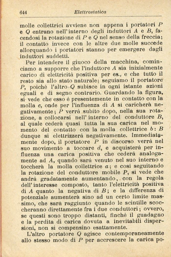 Per intendere il giuoco della macchina, cominciamo a supporre che l'induttore A sia inizialmente carico di elettricità positiva per es., e che tutto il resto sia allo stato naturale; seguiamo il portatore P, poiché l'altro Q subisce in ogni istante azioni eguali e di segno contrario. Guardando la figura, si vede che esso è presentemente in contatto con la molla e, onde per l'influenza di A si caricherà negativamente; P verrà subito dopo, nella sua rotazione, a collocarsi nell' interno del conduttore B, al quale cederà quasi tutta la sua carica nel momento del contatto con la molla collettrice b : B dunque si elettrizzerà negativamente. Immediatamente dopo, il portatore P in discorso verrà nel suo movimento a toccare d, e acquisterà per influenza una carica positiva che cederà analogamente ad A, quando sarà venuto nel suo interno e toccherà la molla collettrice a; e così seguitando la rotazione del conduttore mobile p, si vede che andrà gradatamente aumentando, . con la regola dell' interesse composto, tanto l'elettricità positiva di A quanto la negativa di B ; e la differenza di potenziale aumenterà sino ad un certo limite massimo, che sarà raggiunto quando le scintille scoccheranno direttamente fra i due conduttori ; ovvero, se questi sono troppo distanti, finché il guadagno e la perdita di carica dovuta a inevitabili dispersioni, non si compensino esattamente.