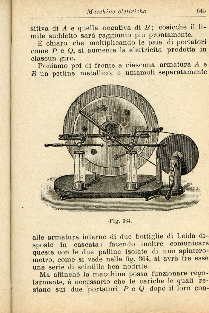 alle armature interne di due bottiglie di Leida disposte in cascata : facendo inoltre comunicare queste con le due palline isolate di uno spinterometro, come si vede nella fig. 364, si avrà fra esse una serie di scintille ben nodrite.