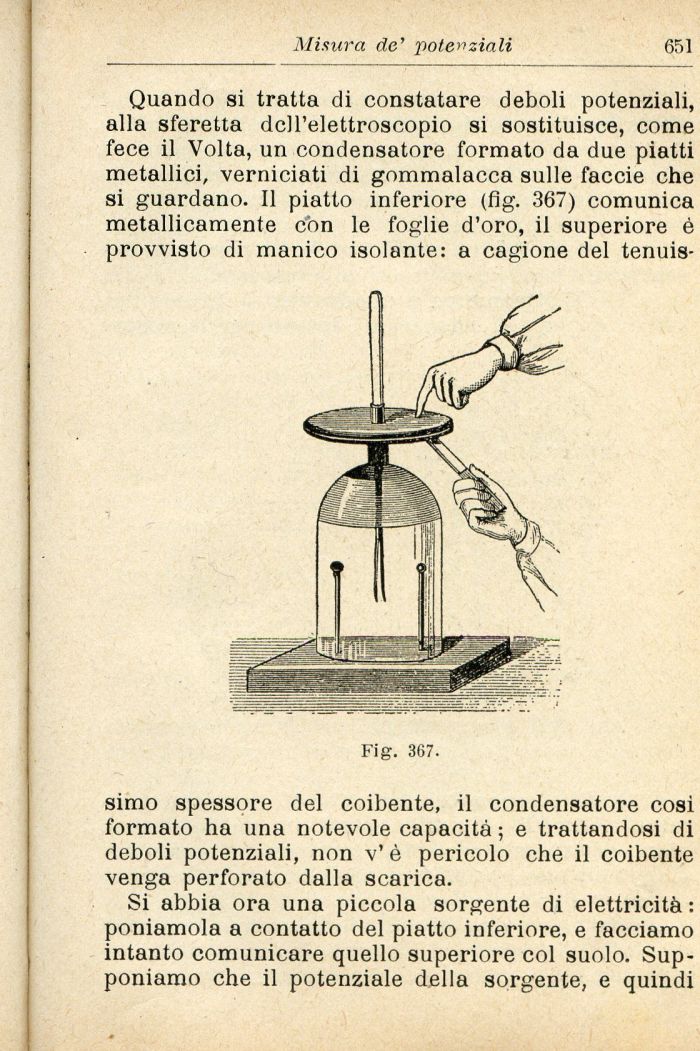Quando si tratta di constatare deboli potenziali, alla sferetta dell'elettroscopio si sostituisce, come fece il Volta, un condensatore formato da due piatti metallici, verniciati di gommalacca sulle faccie che si guardano. Il piatto inferiore (fig. 367) comunica metallicamente con le foglie d'oro, il superiore č provvisto di manico isolante: a cagione del tenuis-