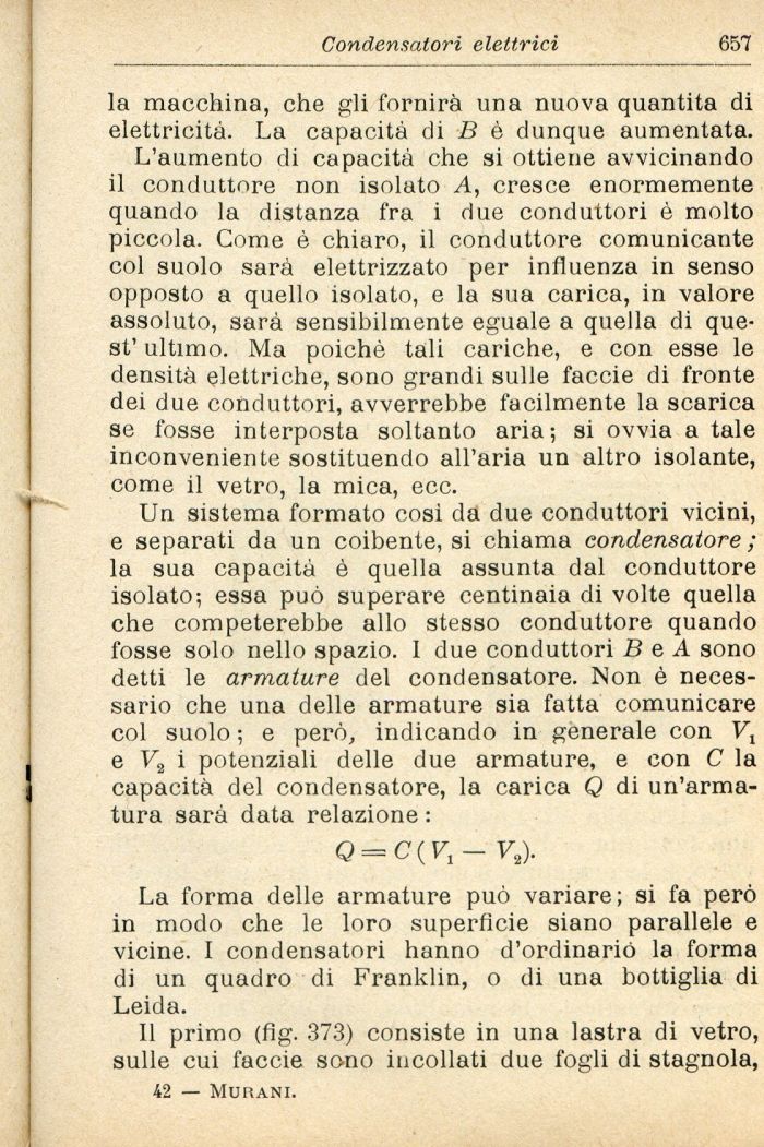 Un sistema formato così da due conduttori vicini, e separati da un coibente, si chiama condensatore ; la sua capacità è quella assunta dal conduttore isolato; essa può superare centinaia di volte quella che competerebbe allo stesso conduttore quando fosse solo nello spazio. I due conduttori B e A sono detti le armature del condensatore. Non è necessario che una delle armature sia fatta comunicare col suolo ; e però, indicando in generale con Vl e V2 i potenziali delle due armature, e con C la capacità del condensatore, la carica Q di un'armatura sarà data relazione :