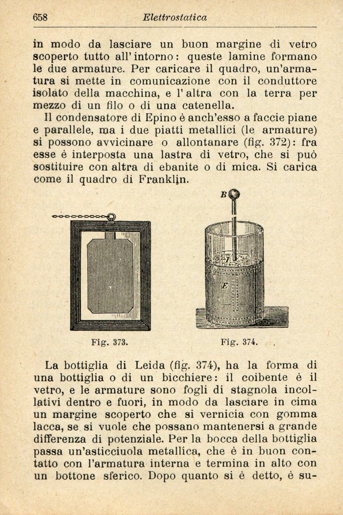 La bottiglia di Leida (fig. 374), ha la forma di una bottiglia o di un bicchiere : il coibente è il vetro, e le armature sono fogli di stagnola incollativi dentro e fuori, in modo da lasciare in cima un margine scoperto che si vernicia con gomma lacca, se si vuole che possano mantenersi a grande differenza di potenziale. Per la bocca della bottiglia passa un'asticciuola metallica, che è in buon contatto con l'armatura interna e termina in alto con un bottone sferico. Dopo quanto si è detto, è su-