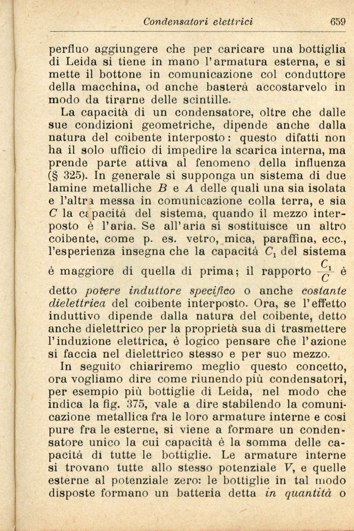 In seguito chiariremo meglio questo concetto, ora vogliamo dire come riunendo più condensatori, per esempio più bottiglie di Leida, nel modo che indica la fig. 375, vale a dire stabilendo la comunicazione metallica fra le loro armature interne e così pure fra le esterne, si viene a formare un condensatore unico la cui capacità è la somma delle capacità di tutte le bottiglie. Le armature interne si trovano tutte allo stesso potenziale V, e quelle esterne al potenziale zero: le bottiglie in tal modo disposte formano un batteria detta in quantità o