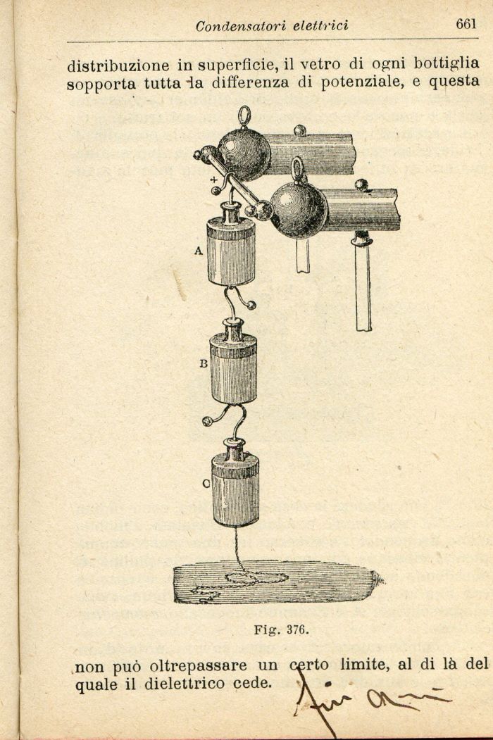 Condensatori elettrici 6fil distribuzione in superficie, il vetro di ogni bottiglia sopporta tutta -la differenza di potenziale, e questa Fig. 376. non puņ oltrepassare un quale il dielettrico cede. ^rto limite, al di lą del