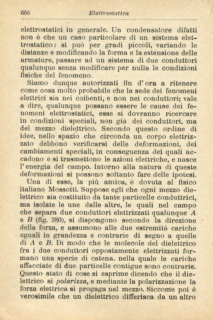 Una di esse, la più amica, è dovuta al fisico italiano Mossotti. Suppose egli che ogni mezzo dielettrico sia costituito da tante particelle conduttrici, ma isolate le une dalle altre, le quali nel campo che separa due conduttori elettrizzati qualunque A e B (fig. 380), si dispongono secondo la direzione della forza, e assumono alle due estremità cariche eguali in grandezza e contrarie di segno a quelle di A e B. Di modo che le molecole del dielettrico fra i due conduttori oppostamente elettrizzati formano una specie di catena, nella quale le cariche affacciate di due particelle contigue sono contrarie. Questo stato di cose si esprime dicendo che il dielettrico si polarizza, e mediante la polarizzazione la forza elettrica si progaga nel mezzo. Siccome poi è verosimile che un dielettrico differisca da un altro