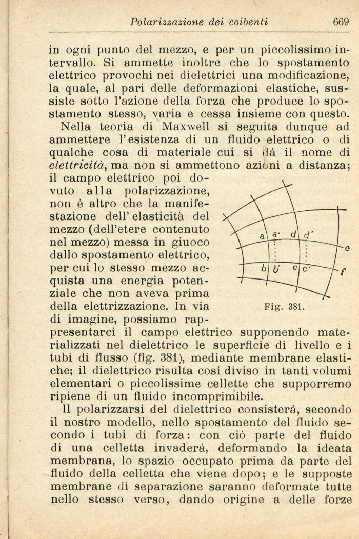Nella teoria di Maxwell si seguita dunque ad ammettere l'esistenza di un fluido elettrico o di qualche cosa di materiale cui si ria il nome di elettricità, ma non si ammettono azioni a distanza; il campo elettrico poi dovuto alla polarizzazione, non è altro che la manifestazione dell' elasticità del mezzo (dell'etere contenuto nel mezzo) messa in giuoco dallo spostamento elettrico, per cui lo stesso mezzo acquista una energia potenziale che non aveva prima della elettrizzazione. In via Fig. 381.