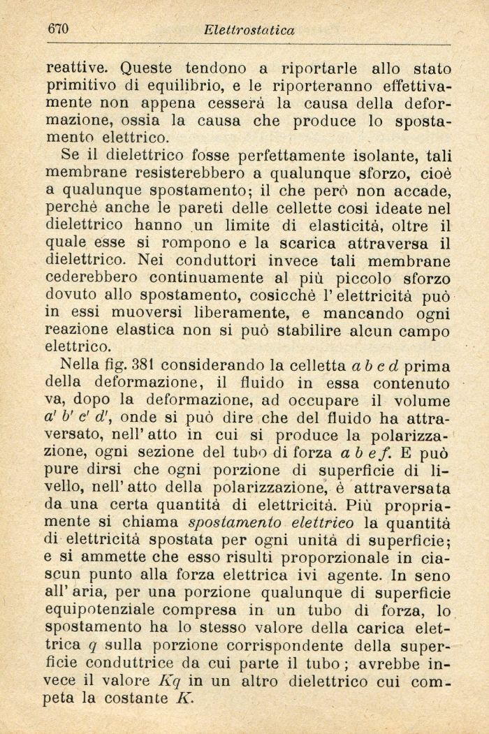 Nella fig. 381 considerando la celletta ab e d prima della deformazione, il fluido in essa contenuto va, dopo la deformazione, ad occupare il volume a' b' e' d', onde si può dire che del fluido ha attraversato, nell' atto in cui si produce la polarizzazione, ogni sezione del tubo di forza ab ef. E può pure dirsi che ogni porzione di superfìcie di livello, nell' atto della polarizzazione, è attraversata da una certa quantità di elettricità. Più propriamente si chiama spostamento elettrico la quantità di elettricità spostata per ogni unità di superfìcie; e si ammette che esso risulti proporzionale in ciascun punto alla forza elettrica ivi agente. In seno all'aria, per una porzione qualunque di superfìcie equipotenziale compresa in un tubo di forza, lo spostamento ha lo stesso valore della carica elettrica q sulla porzione corrispondente della superfìcie conduttrice da cui parte il tubo ; avrebbe invece il valore Kq in un altro dielettrico cui competa la costante K.