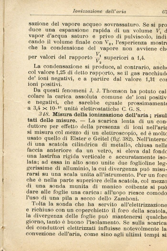 Da questi fenomeni J. .1. Thomson ha potuto cai colare la carica assoluta comune de' ioni positiv e negativi, che sarebbe eguale prossimamente a 3,4 x IO-10 unità elettrostatiche C. G. S.