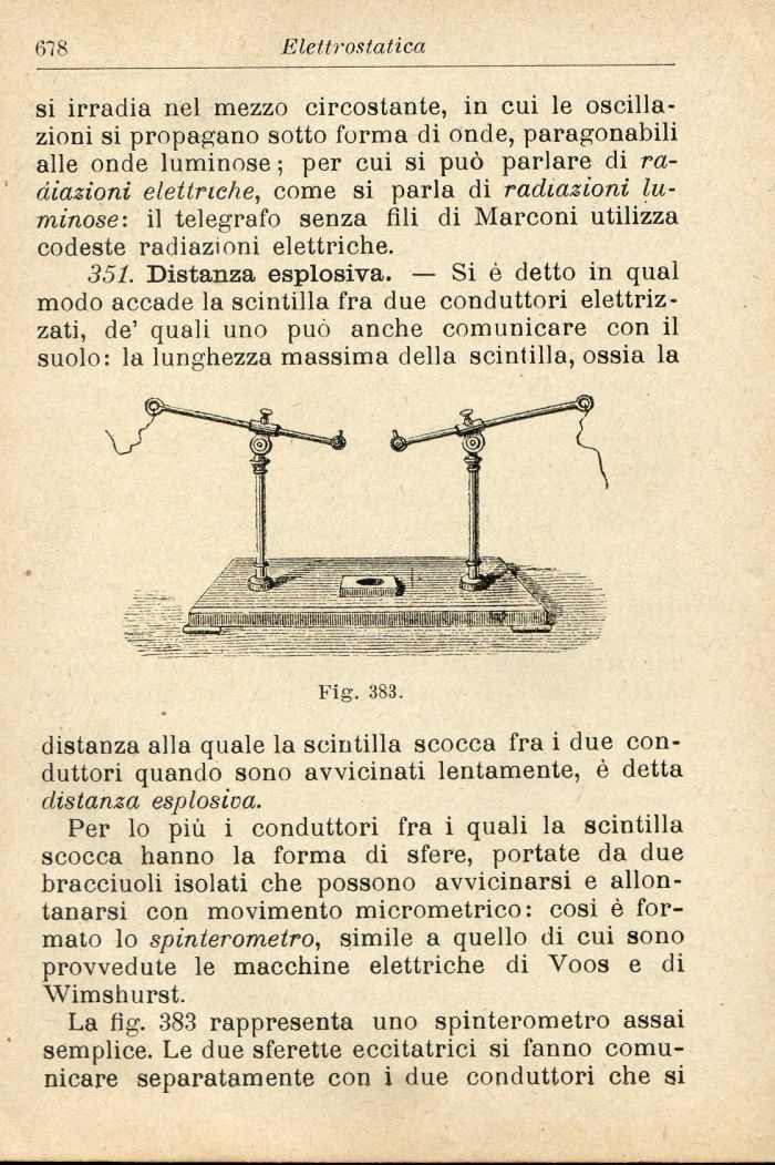La fig. 383 rappresenta uno spinterometro assai semplice. Le due sferette eccitatrici si fanno comunicare separatamente con i due conduttori che si